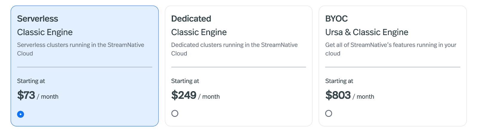 StreamNative Serverless pricing is simple and transparent, based on the Elastic Throughput Unit (ETU). Each ETU costs $0.10 per hour (about $73 per month), and customers can start with just 1 ETU minimum. As workloads grow, additional ETUs can be added seamlessly, ensuring that you only pay for the capacity you actually use. This flexible, pay-as-you-go model means there’s no need to commit to large upfront infrastructure costs—you scale up or down as your data streaming demands change, with full cost predictability.