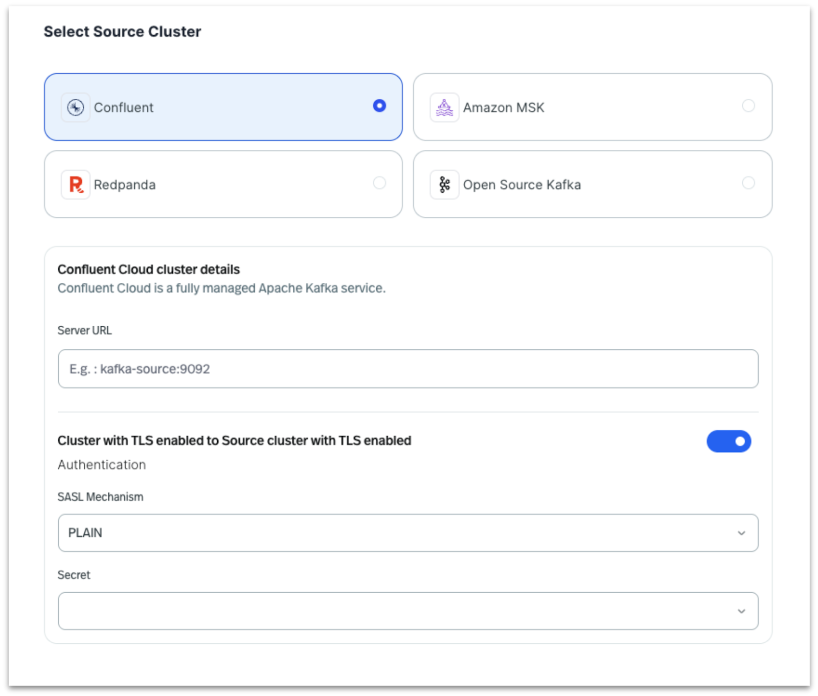 StreamNative Universal Linking features a native, user-friendly UI that streamlines the setup process for connecting to various Kafka providers. Whether users are working with Confluent, Redpanda, Amazon MSK, or open-source Kafka, the interface dynamically adjusts to capture provider-specific configuration fields. This tailored experience simplifies the authentication setup by guiding users through the exact parameters required for each provider, reducing complexity and ensuring secure, accurate connections with minimal effort.
