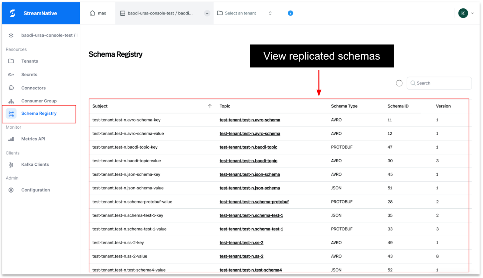 - Schema Visibility: Access details of schemas registered and synced during replication, allowing you to verify that your topic data and schema evolution are accurately preserved in StreamNative Cloud.