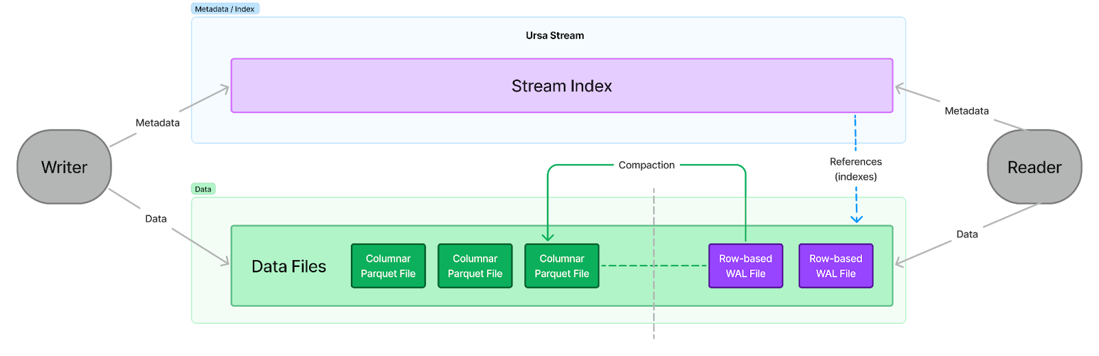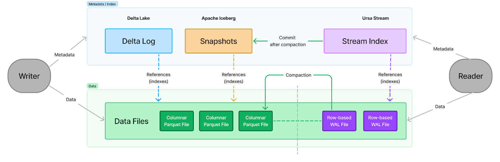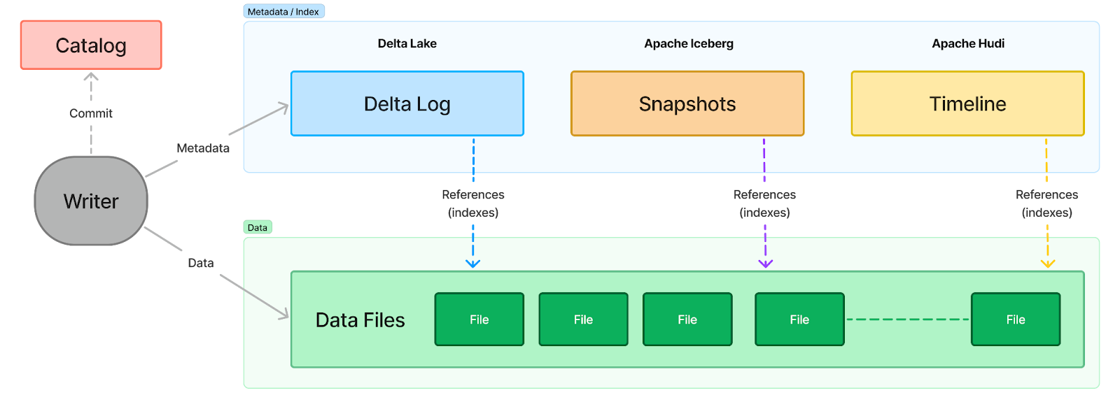 Returning to the initial discussion, it's important to recognize that a stream is fundamentally similar to an append-only table. A lakehouse table is essentially a collection of Parquet files. These Parquet files can be indexed by a Write-Ahead Log (WAL) in Delta Lake, manifest files in Apache Iceberg, or a timeline in Apache Hudi. In essence, lakehouse tables are composed of a set of files (representing the data) and an index (representing the metadata), encapsulating the concept of the index/data split discussed in data streaming (see the diagram below).