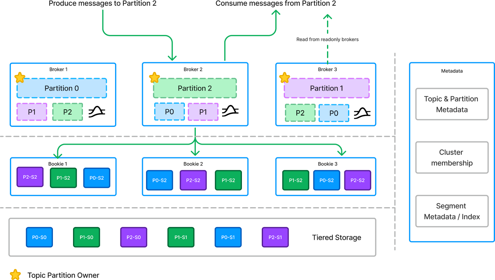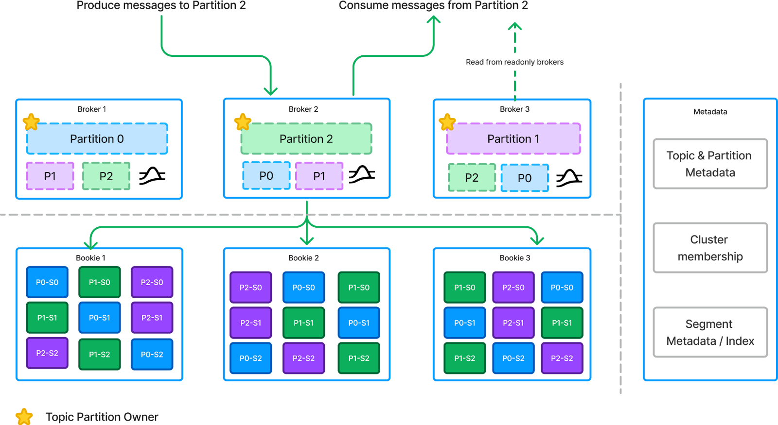 - Logical Partitions: Partitions in Pulsar are treated as logical entities. Brokers manage the ownership of topic partitions but do not store any data locally. Instead, all data is stored in a remote segment storage system called Apache BookKeeper.