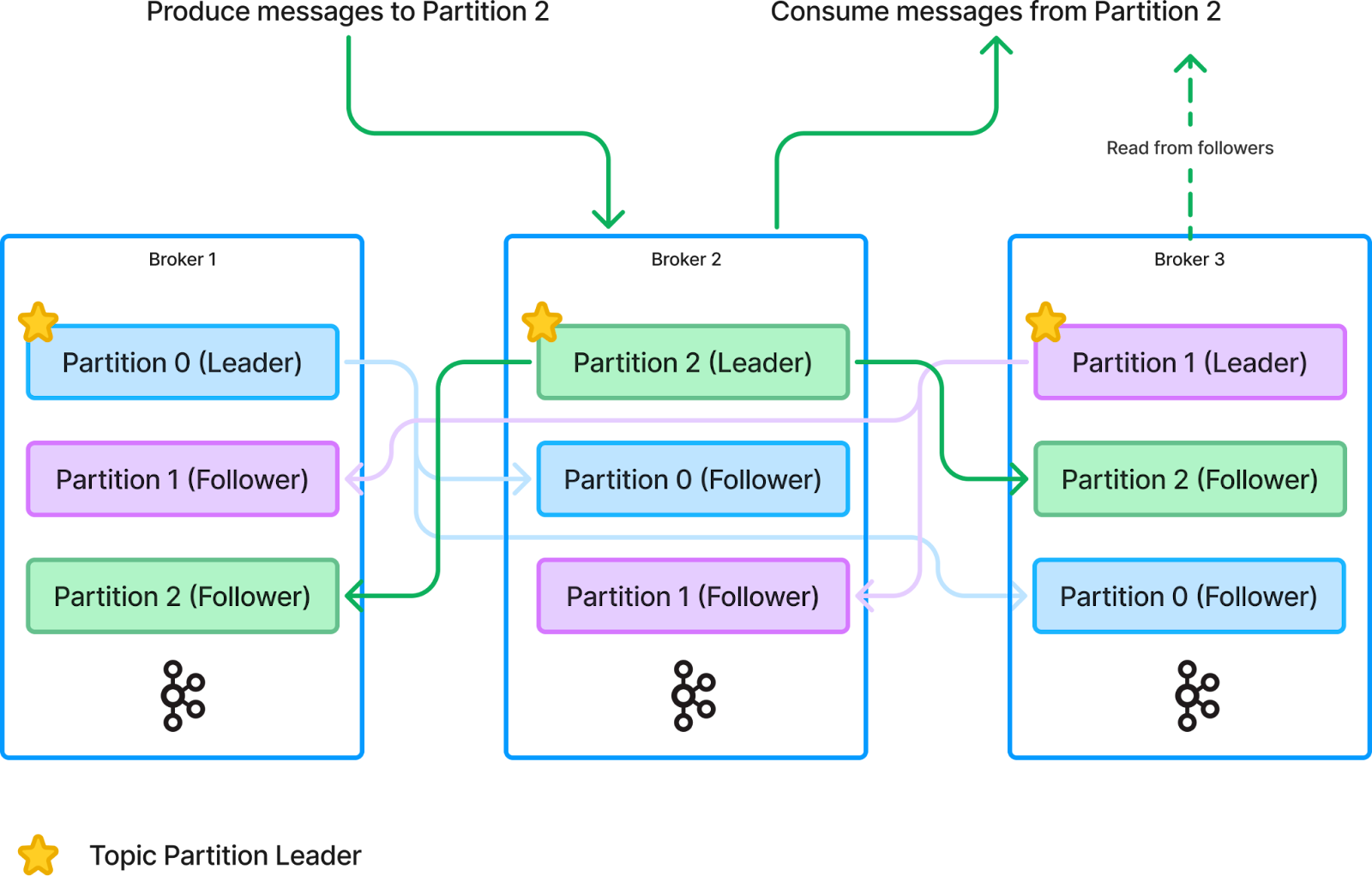 - Replication: Kafka ensures durability and fault tolerance through replication. Each partition has a configurable number of replicas, with one designated as the leader. The leader handles all reads and writes, while the other replicas, known as followers, replicate data from the leader. If the leader fails, one of the followers is promoted to leader, ensuring high availability.