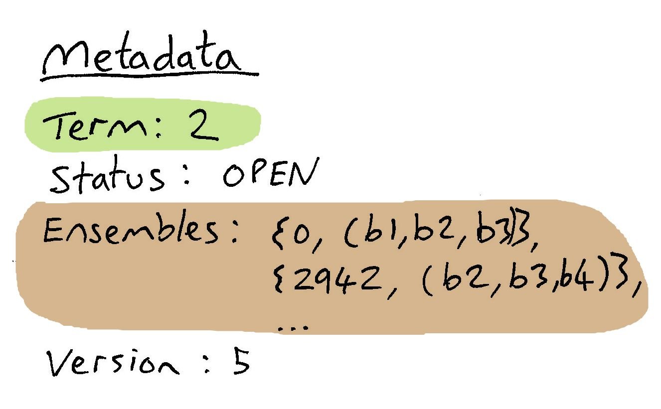 The metadata gets a new field for term but the existing ensembles field would need to be modified as the list of ensembles (fragments) could grow very large due to the long lived nature of a ledger. In order to enforce data retention policies, the systems that use BookKeeper would need to be able to delete fragments, rather than ledgers.