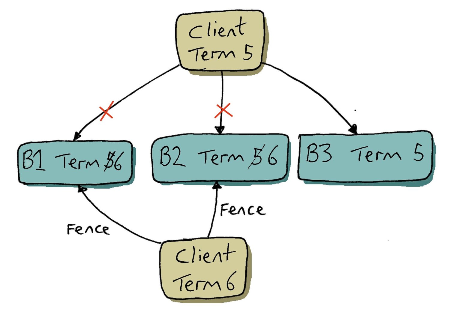 The one documented in this post does not include the term as part of an entry identifier or even a fragment identifier, it is for fencing alone. However, for that to be safe it requires at least a subset of the “guaranteed write quorum” changes detailed in the last post and also a final truncate no-op entry as the last entry to be written back during recovery. To understand why see the following: