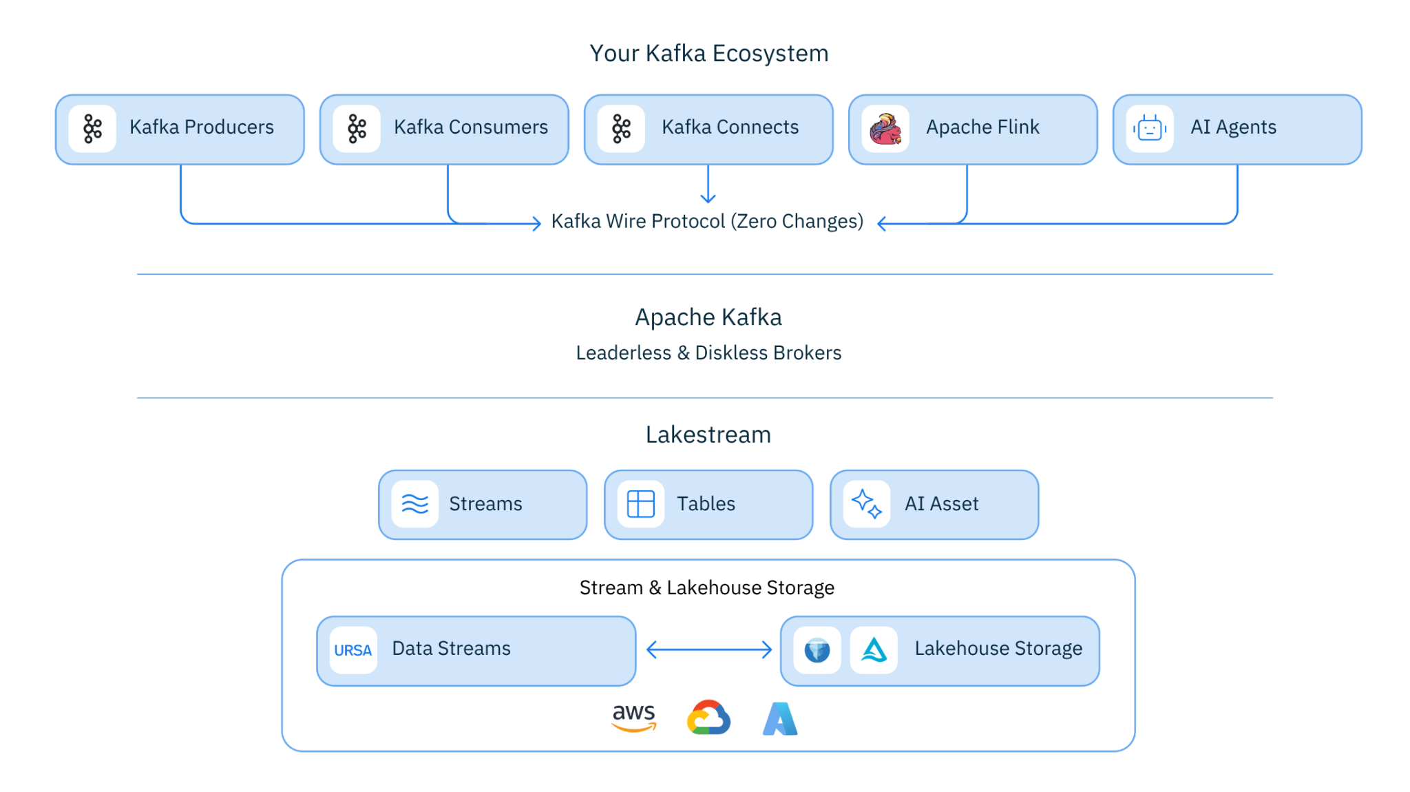 Ursa For Kafka (UFK) is native Apache Kafka -- not compatible, native -- running on Lakestream's lakehouse-native foundation. Every Kafka topic is a lakehouse table. No connectors. No ETL. Just Kafka, reimagined for the lakehouse era.